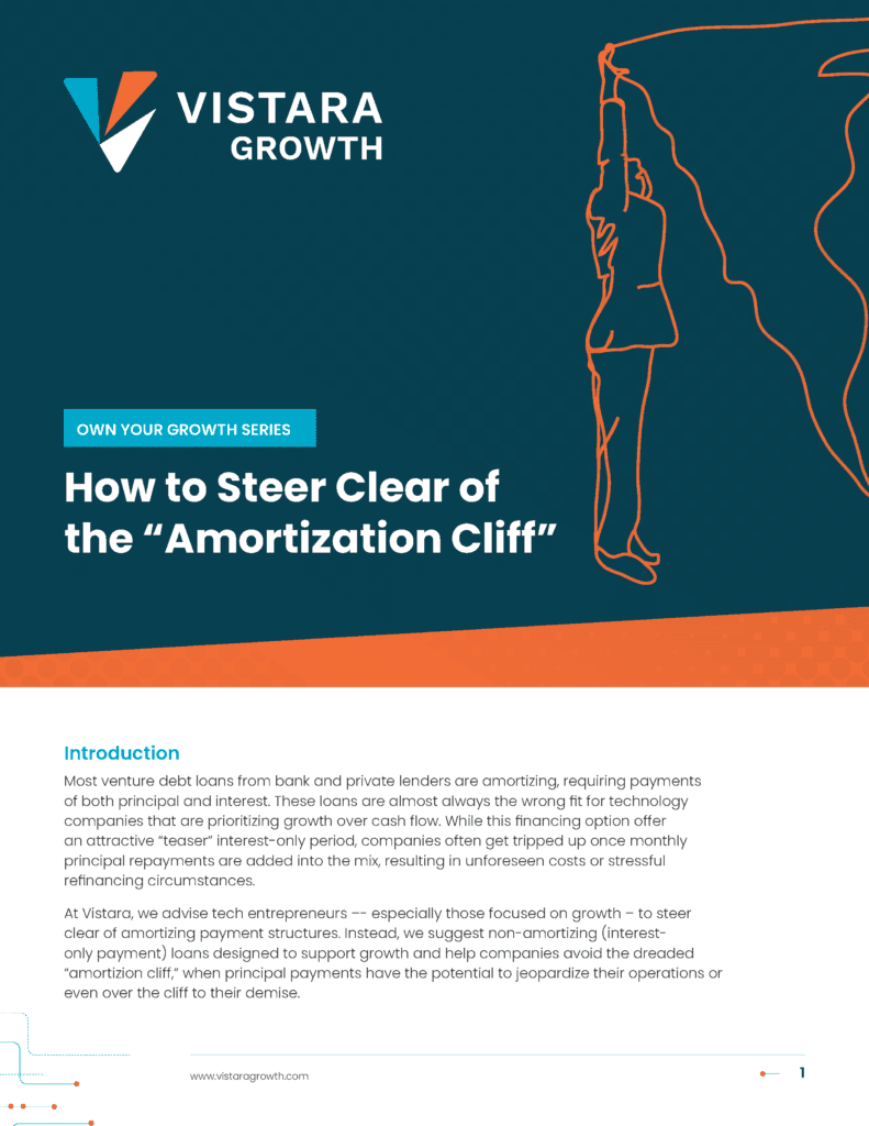 Sadly, amortization has eliminated the entrepreneur-player, so we say, “don’t hate the player, hate the amortization game!” Unfortunately, the vast majority of “venture debt” loans from both bank and private lenders are amortizing, and are almost always the wrong fit for technology companies that are prioritizing growth over cash flow. Our advice to entrepreneurs is to avoid amortizing payment structures altogether (several funds including Vistara provide non-amortizing loans) and avoid the dreaded “amortizing loan faceplant.”
